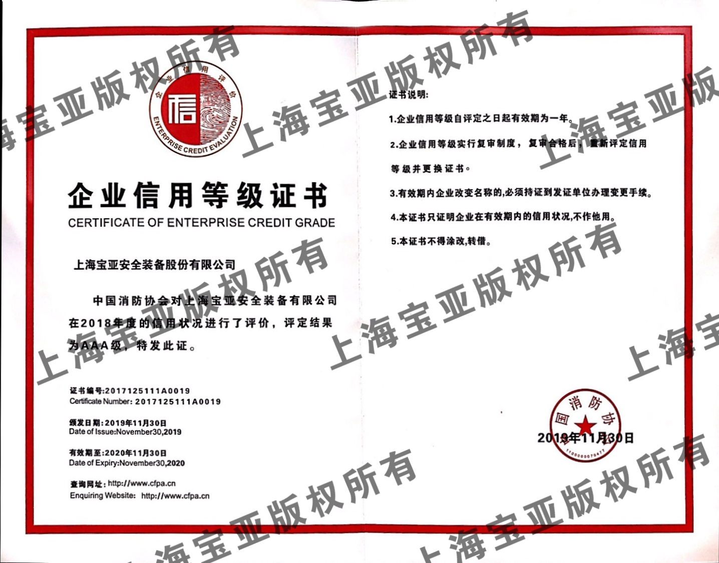 日前,上海寶亞順利通過中國消防協(xié)會(huì)的企業(yè)信用復(fù)審,維持原有級(jí)別:AAA級(jí)。