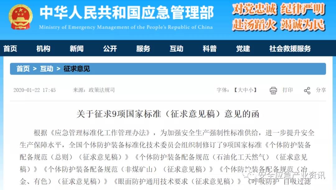 2020年1月22日,應(yīng)急管理部政策法規(guī)司發(fā)布了《關(guān)于征求9項國家標準(征求意見稿)意見的函》,對全國個體防護裝備標準化技術(shù)委員會組織制修訂的9項國家標準面向社會公開征求意見。其中,《個體防護裝備配備規(guī)范(總則)(征求意見稿)》《個體防護裝備配備規(guī)范(石油化工天然氣)(征求意見稿)》《個體防護裝備配備規(guī)范(非煤礦山)(征求意見稿)》《個體防護裝備配備規(guī)范(冶金、有色)(征求意見稿)》在列。