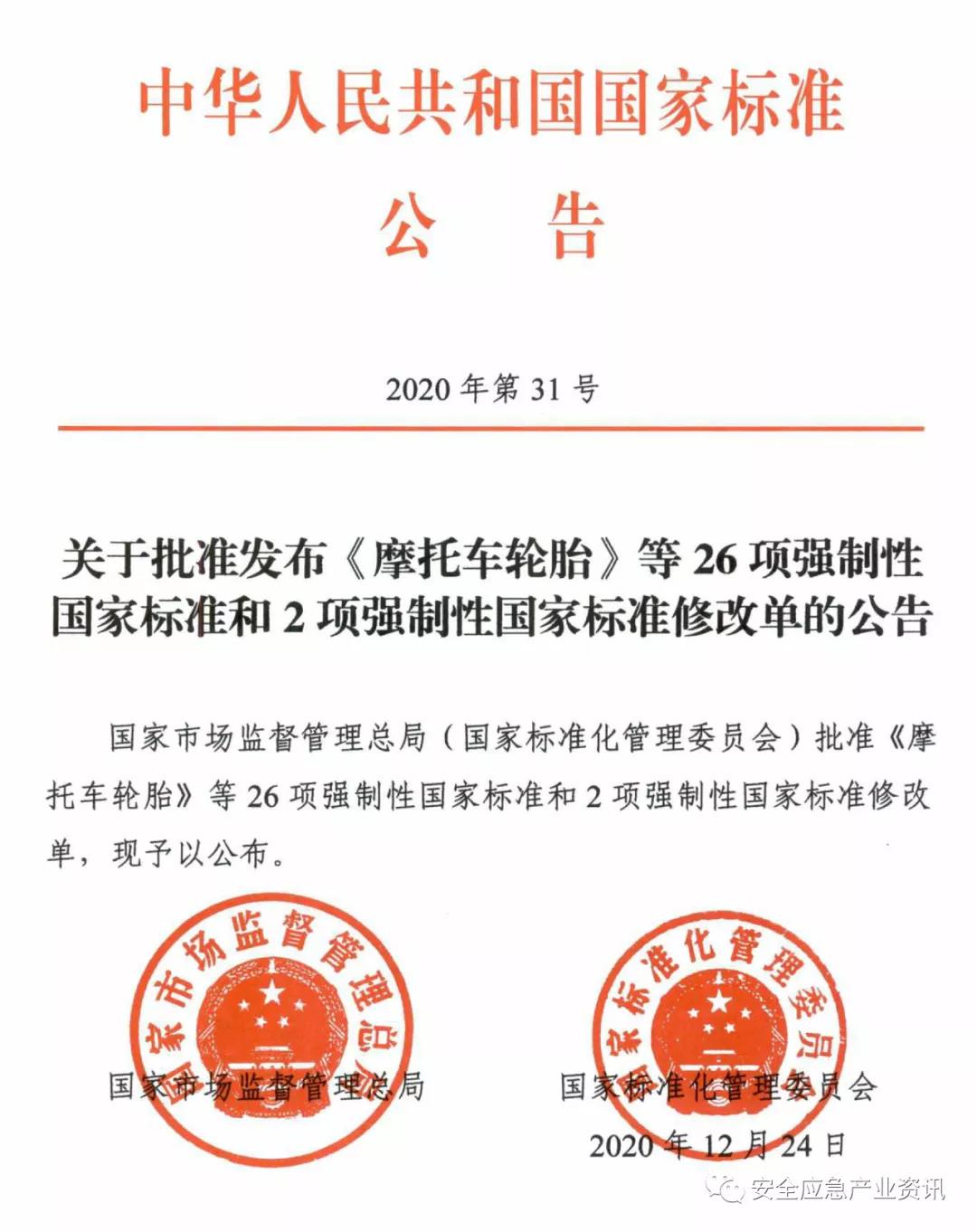 2020年12月29日,國家市場監(jiān)管總局、國家標準化管理委員會聯(lián)合印發(fā)《關(guān)于批準發(fā)布<摩托車輪胎>等26項強制性國家標準和2項強制性國家標準修改單的公告》(2020年第31號),其中包括4項個體防護裝備配備規(guī)范方面的強制性國家標準。