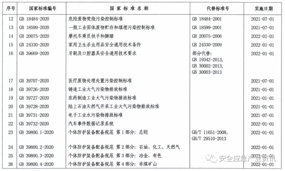 根據(jù)該公告,GB 39800.1-2020《個體防護裝備配備規(guī)范 第1部分:總則》將代替GB/T 11651-2008 《個體防護裝備選用規(guī)范》、GB/T 29510-2013《個體防護裝備配備基本要求》,并將于2022年1月1日實施。GB 39800.2-2020《個體防護裝備配備規(guī)范 第2部分:石油、化工、天然氣》、GB 39800.3-2020《個體防護裝備配備規(guī)范 第3部分:冶金、有色》、GB 39800.4-2020《個體防護裝備配備規(guī)范 第4部分:非煤礦山》也將于2022年1月1日實施。