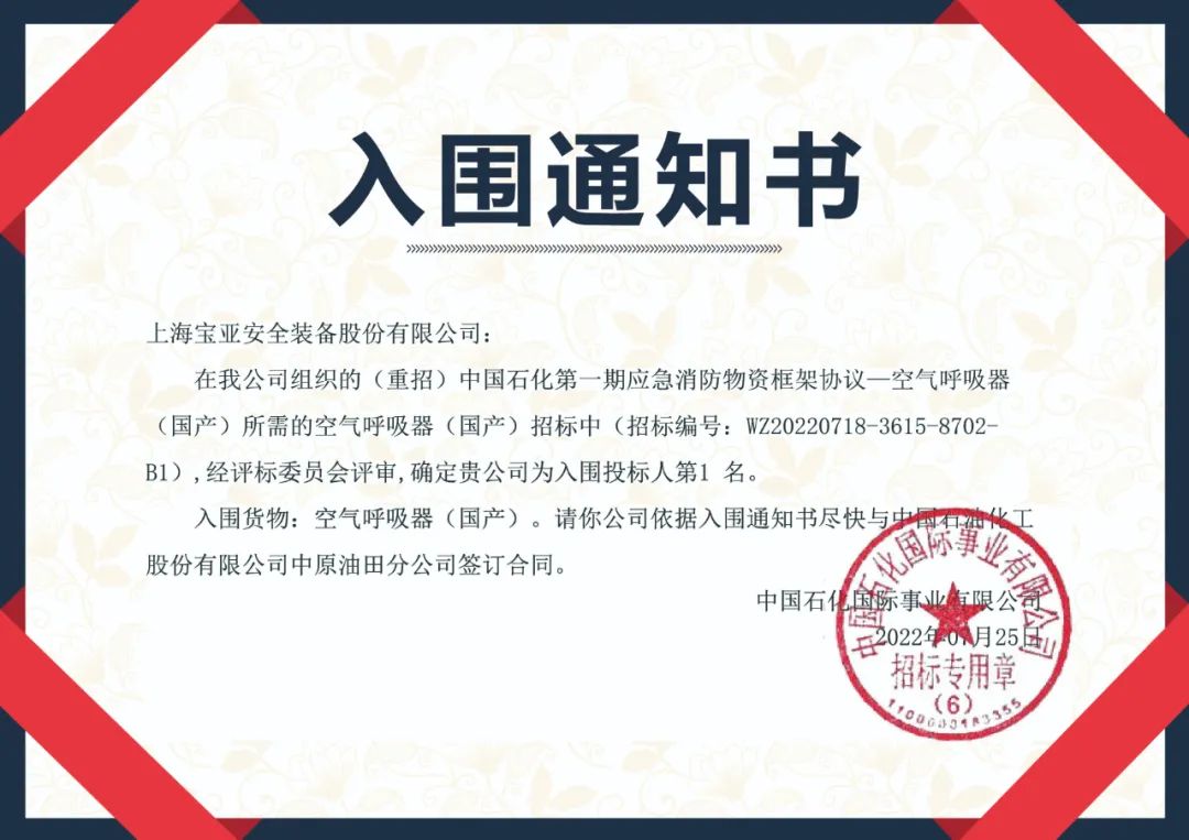 2022年7月18日,上海寶亞安全裝備股份有限公司在中石化中原油田分公司組織的中國石化第一期應(yīng)急消防物資框架協(xié)議-空氣呼吸器(國產(chǎn))設(shè)備采購項目的競標(biāo)中,憑借雄厚的技術(shù)實力,可靠的產(chǎn)品質(zhì)量和良好的企業(yè)信譽,以絕對優(yōu)勢順利中標(biāo)。在此特向全國渠道合作伙伴通報喜訊。