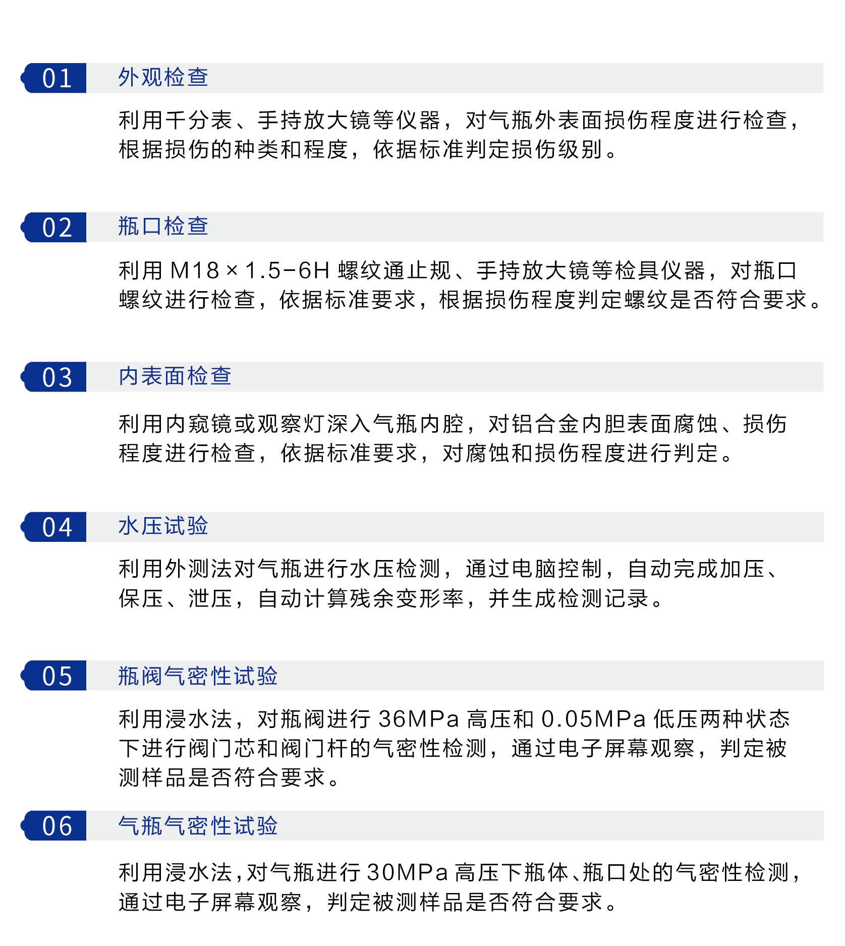 依據(jù)GB/T24161-2009《呼吸器用復(fù)合氣瓶定期檢驗(yàn)與評(píng)定》 、GB/T9251-2011《氣瓶水壓試驗(yàn)方法》、GB/T12137-2015《氣瓶氣密性試驗(yàn)方法》、GB/T34527-2017《空氣呼吸器用氣瓶閥技術(shù)條件》等標(biāo)準(zhǔn)建立了完善的檢驗(yàn)工藝流程和設(shè)備安全操作規(guī)程,可對(duì)呼吸器用復(fù)合氣瓶進(jìn)行以下項(xiàng)目檢測(cè):