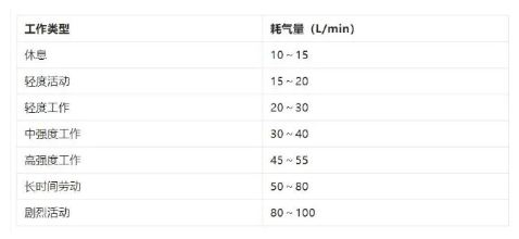 通常對使用空氣呼吸器的人員來說,作業(yè)強度屬于高強度工作到劇烈活動之間,因此耗氣量普遍偏高。
