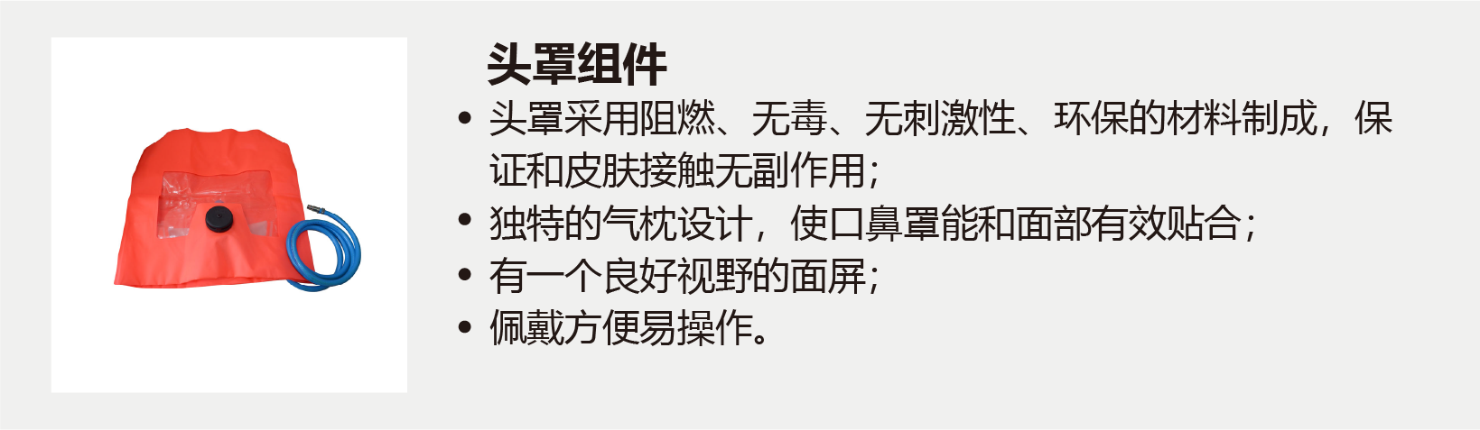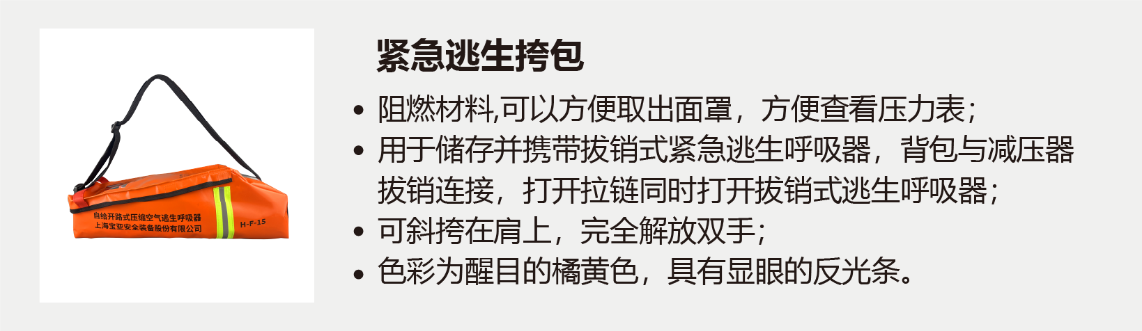 本產(chǎn)品是搶險(xiǎn)救災(zāi)以及突發(fā)事故時(shí)逃離危險(xiǎn)氣體及缺氧環(huán)境時(shí)使用,呼吸時(shí)使用氣瓶?jī)?nèi)的空氣,不依賴外界環(huán)境氣體,以恒定的流量向頭罩內(nèi)供氣,供使用人員呼吸。