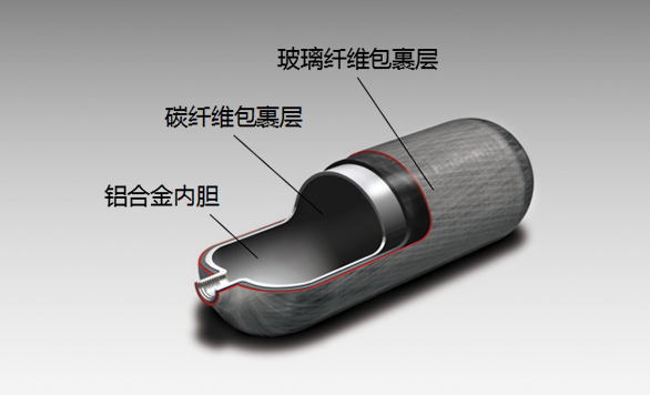 1. 氣瓶由內(nèi)到外分別由鋁合金內(nèi)膽、碳纖維包裹層、玻璃纖維包裹層、環(huán)氧樹脂保護(hù)層四層組成。