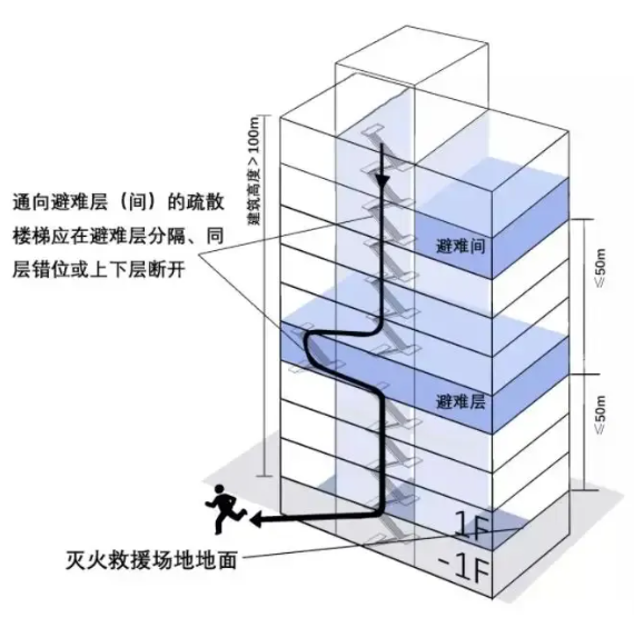 避難層是建筑內(nèi)用于人員暫時(shí)躲避火災(zāi)及其煙氣危害的樓層,在逃生受阻情況下,人員可就近疏散到避難層等待消防員到場(chǎng)進(jìn)行救援。