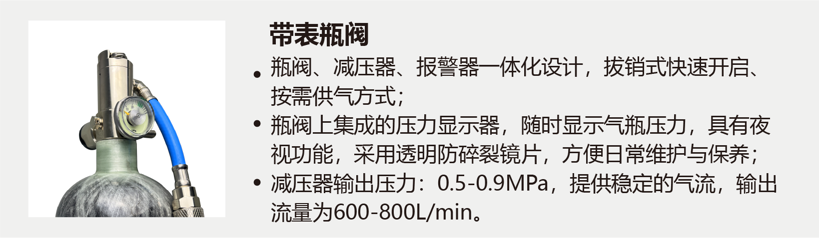本產(chǎn)品是搶險(xiǎn)救災(zāi)以及突發(fā)事故時(shí)逃離危險(xiǎn)氣體及缺氧環(huán)境時(shí)使用,呼吸時(shí)使用氣瓶?jī)?nèi)的空氣,不依賴外界環(huán)境氣體,以恒定的流量向頭罩內(nèi)供氣,供使用人員呼吸。