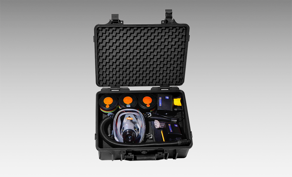 1. 動(dòng)力送風(fēng)過濾式呼吸器是一種強(qiáng)制送風(fēng)過濾的個(gè)人呼吸防護(hù)器材,其工作原理為通過充放式鋰電池驅(qū)動(dòng)風(fēng)機(jī)對(duì)環(huán)境空氣進(jìn)行強(qiáng)制過濾,并且通過導(dǎo)氣管送入面罩,提供清潔的空氣,有效地保護(hù)佩戴人員的面部皮膚,眼部和呼吸道免受毒劑和放射性塵埃的傷害。