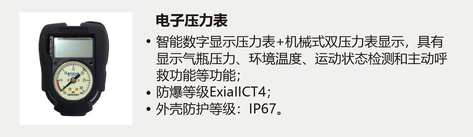 4.采用智能數(shù)字顯示壓力表+機(jī)械式雙壓力表顯示,具有顯示氣瓶壓力、環(huán)境溫度、運(yùn)動(dòng)狀態(tài)檢測(cè)和主動(dòng)呼救功能等功能;